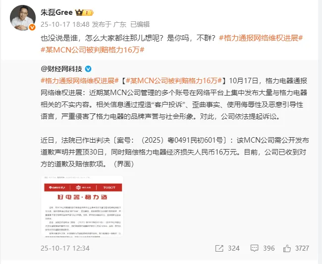 需要補(bǔ)充的是,消息面上,在上周五(10月17日),據(jù)格力“格力文傳”公眾號(hào)消息:近日,法院判決該MCN公司需公開(kāi)發(fā)布道歉聲明并置頂30日,同時(shí)賠償格力電器經(jīng)濟(jì)損失16萬(wàn)元。