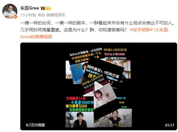 第一條發(fā)布時(shí)間是板格不再在21:05分,朱磊發(fā)布了一條多位博主以“同樣是管制1.5匹空調(diào),為什么小米1700 而格力卻要3000多”為主題的造業(yè)視頻集合。