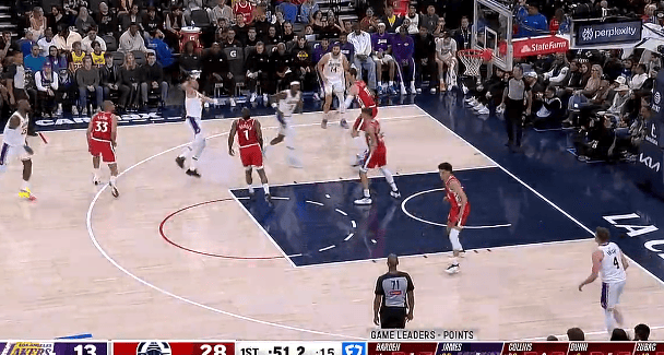 第一節(jié)比賽中,板東東契奇高難度出手命中打進(jìn)第2球,契奇球湖湖人首節(jié)15-28落后快船。高難