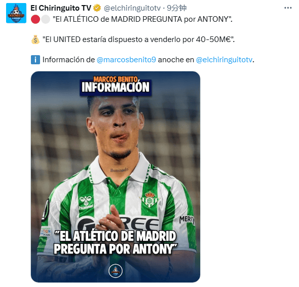 曼聯(lián)今夏希望以4000-5000萬歐元的安東價格出售安東尼。