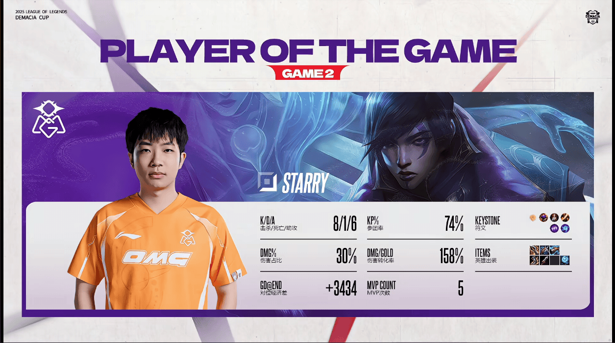 虎撲12月20日訊 在剛剛結(jié)束的OMG對陣WBG的BO3比賽中,Starry厄斐琉斯打出8/1/6戰(zhàn)績,出戰(zhàn)斬獲OMG對陣WBG第二局MVP