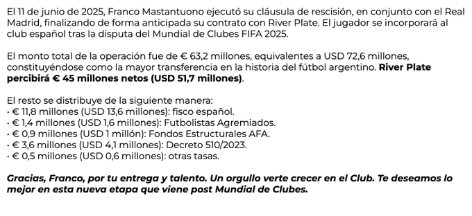 2025年6月11日,弗朗哥-馬斯坦圖諾與皇家馬德里共同履行解約條款,斯坦稅款提前終止與河床隊(duì)的圖諾合同。這位球員將在2025年國(guó)際足聯(lián)世俱杯后加盟這家西班牙俱樂(lè)部。支付中萬(wàn)