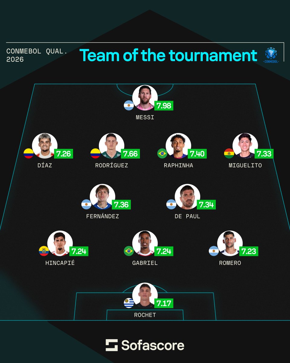 虎撲09月10日訊 Sofascore官號評選出了世界杯南美預選賽賽事最佳陣容