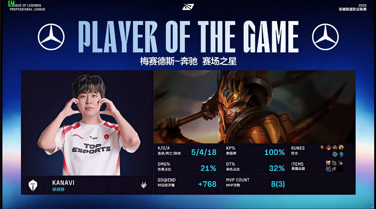 虎撲09月10日訊 在剛剛結(jié)束的TES對陣WBG的BO5比賽中,Kanavi使用皇子打出5/4/18戰(zhàn)績,戰(zhàn)績斬獲陣斬獲TES對陣WBG第二局MVP