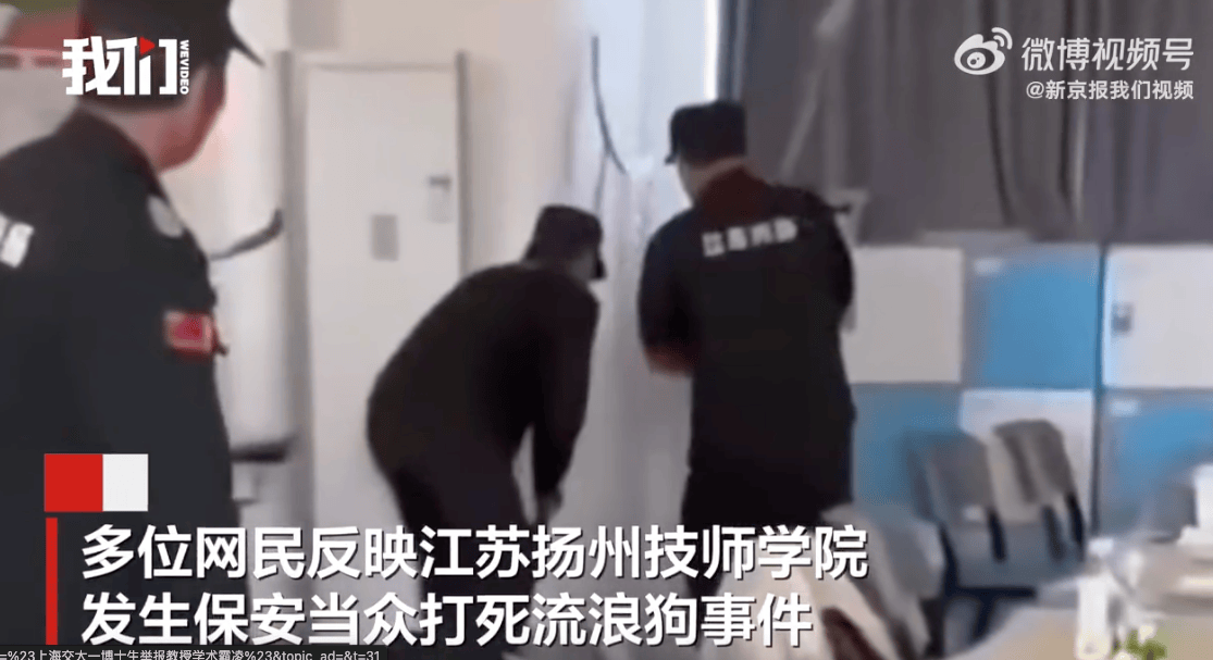 虎撲05月08日訊 江蘇揚(yáng)州技師學(xué)院發(fā)生保安在教室內(nèi)打死流浪犬事件。目擊者反映,應(yīng)流一只在校內(nèi)活動(dòng)多日的進(jìn)入教室流浪犬當(dāng)日進(jìn)入教室后,兩名保安持器械當(dāng)眾打死流浪犬。處置