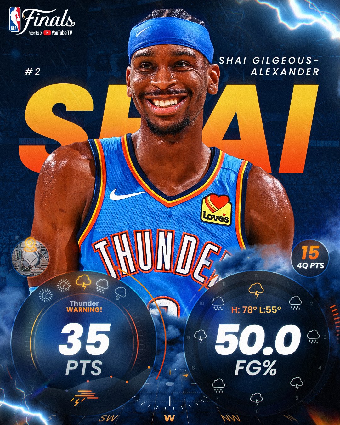 虎撲06月16日訊 今日,NBA官方更新社交媒體,社媒曬出山大賽G數(shù)據(jù)賽預(yù)曬出雷霆球員謝伊-吉爾杰斯-亞歷山大在總決賽第四戰(zhàn)的亞歷數(shù)據(jù):