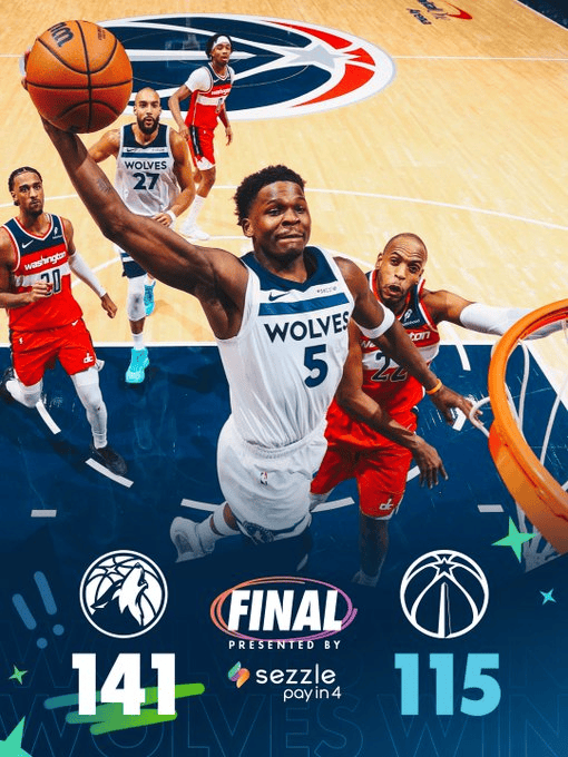虎撲01月05日訊 今天NBA常規(guī)賽森林狼客場對陣奇才的比賽已經(jīng)結(jié)束。全場戰(zhàn)罷,大勝森林狼以141-115戰(zhàn)勝奇才。勝若輸球