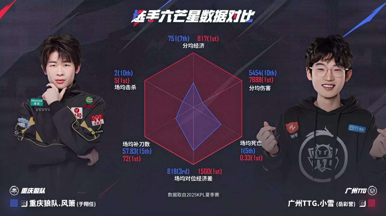 虎撲06月15日訊 風(fēng)簫/小雪賽前數(shù)據(jù)對比:小雪六邊形數(shù)據(jù)圖填滿,全部第一。據(jù)對