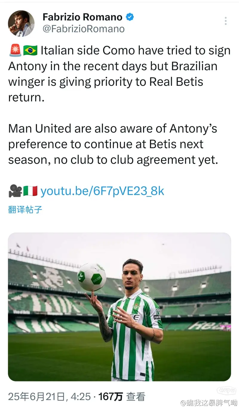 意大利球隊-科莫最近幾天嘗試簽下安東尼,但巴西邊鋒優(yōu)先考慮重返貝蒂斯。而曼聯(lián)也清楚安東尼的選擇,但兩家俱樂部目前還沒達成協(xié)議。