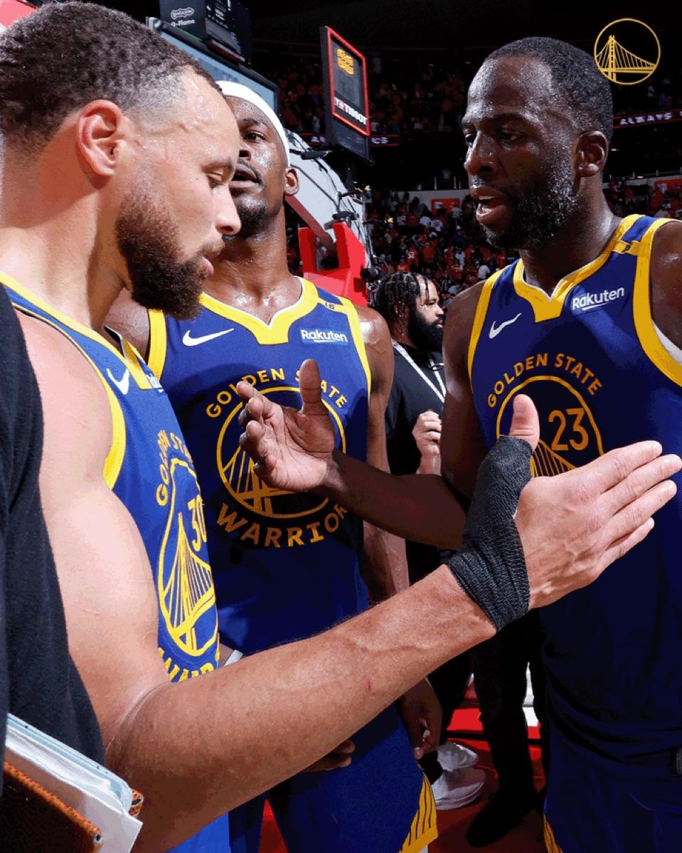 賽后,勇士官方社交媒體曬出斯蒂芬-庫(kù)里、德雷蒙德-格林場(chǎng)邊擊掌照片,慶祝球隊(duì)G1獲勝。