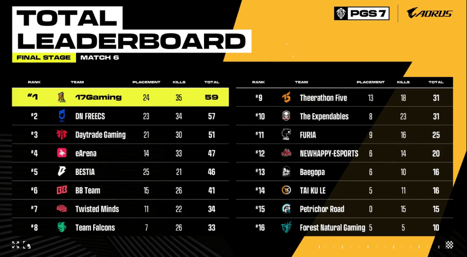 階段6,NH在圈邊被TWIS連狙淘汰,F(xiàn)LC獨(dú)狼也被藍(lán)圈帶走。隨后FOR和TWIS在圈邊交戰(zhàn),F(xiàn)OR率先被淘汰。17進(jìn)攻TE方向,17將TE淘汰。隨后DAY前來勸架將17淘汰。BST也被清理,最后DAY利用地形優(yōu)勢淘汰TWIS成功吃雞。