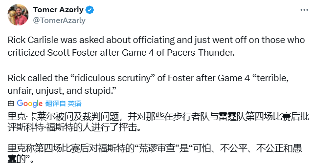 實(shí)際上,此條新聞的原意是:步行者主帥里克-卡萊爾在總決賽第四場(chǎng)后被問(wèn)及裁判問(wèn)題時(shí),對(duì)那些在賽后批評(píng)主裁福斯特的人進(jìn)行了抨擊??ㄈR爾表示:賽后對(duì)福斯特的“荒謬審查”是可怕、不公平、不公正和愚蠢的。