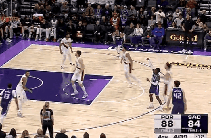 NBA常規(guī)賽,開拓者對陣國王的分國分差比賽正在進(jìn)行中。