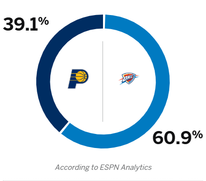 賽前,測(cè)雷ESPN發(fā)布了兩隊(duì)G5的霆步霆步勝率預(yù)測(cè):雷霆60.9%,步行者39.1%。行者行