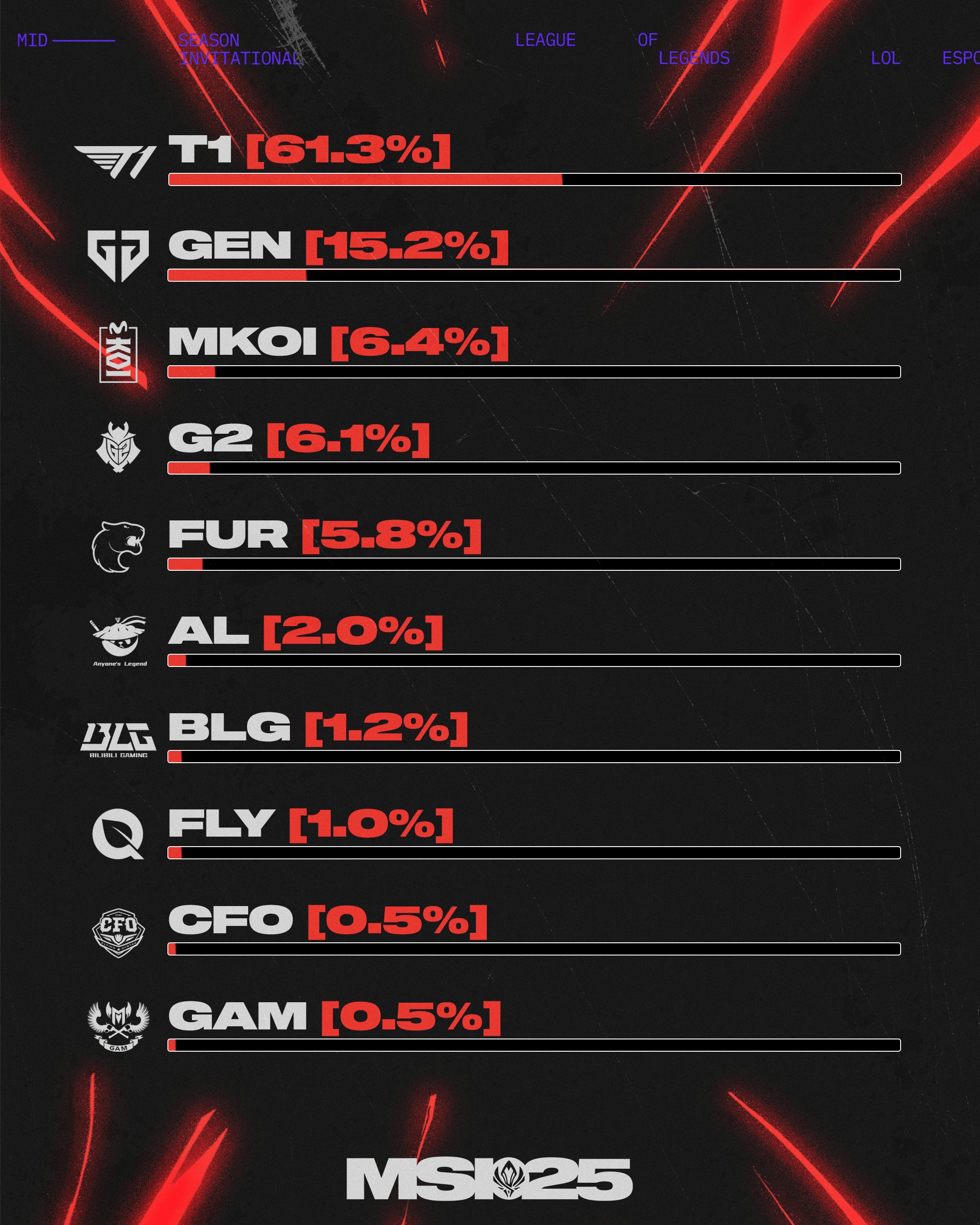 虎撲06月27日訊 LOL官推分享了國外軟件WhatsApp上網(wǎng)友對(duì)MSI冠軍的預(yù)測(cè)結(jié)果。其中61.3%的頭分網(wǎng)友認(rèn)為T1會(huì)拿到MSI冠軍,認(rèn)為GEN會(huì)奪冠的享外則占到15.2%。而支持AL和BLG奪冠的網(wǎng)社分別只有2%和1.2%,只排在第六和第七。冠果超