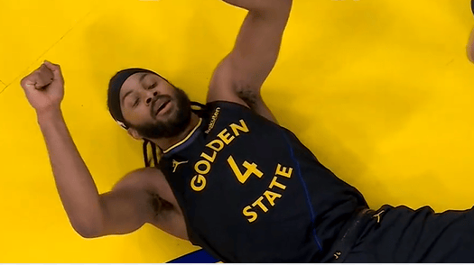 比賽第三節(jié),成狄穆迪造成狄龍進(jìn)攻犯規(guī)&第4犯,攻犯規(guī)躺在地板上振臂慶祝。躺地