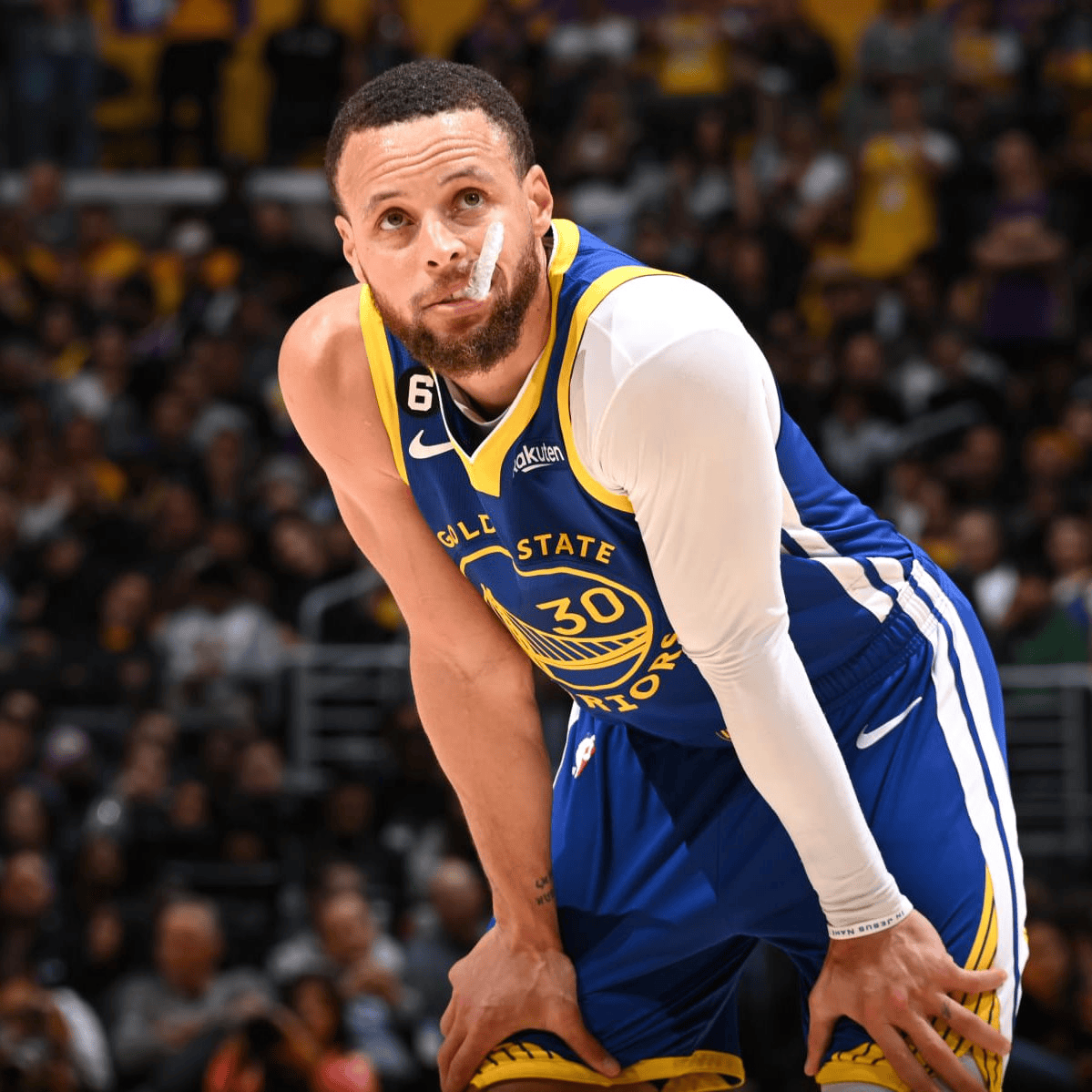 第二節(jié)比賽,腿筋庫里疑似左大腿后側(cè)拉傷,回歸暫停返回更衣室檢查。流言拉傷