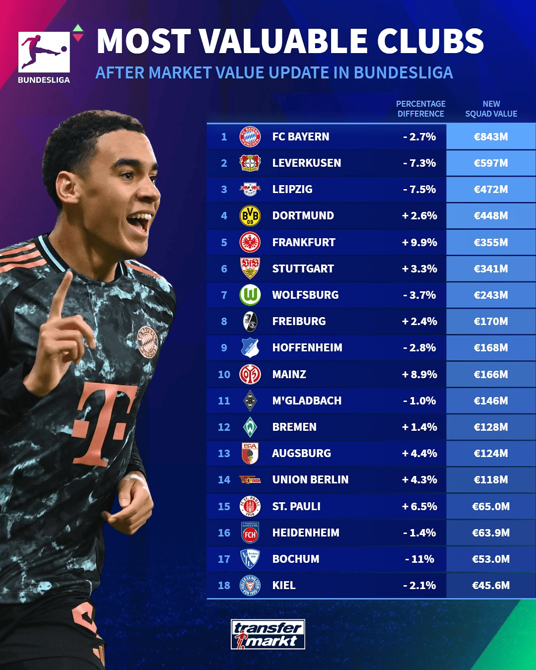 1.拜仁慕尼黑 8.43億歐元(下跌2.7%)