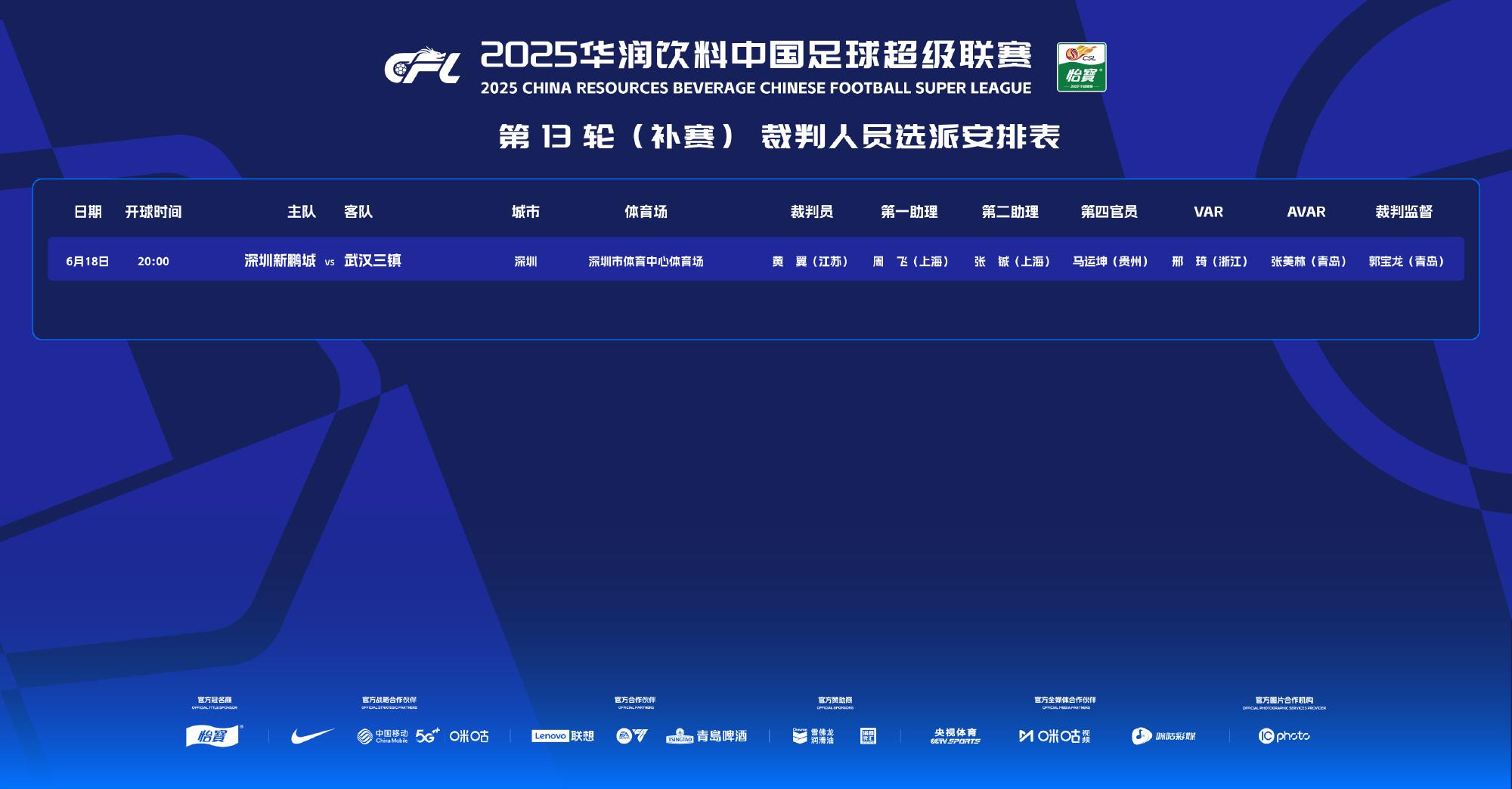 虎撲06月18日訊 今晚深圳新鵬城vs武漢三鎮(zhèn)的第13輪補(bǔ)賽裁判人員名單公布,黃翼?yè)?dān)任主裁判,翼主邢琦出任VAR。裁判