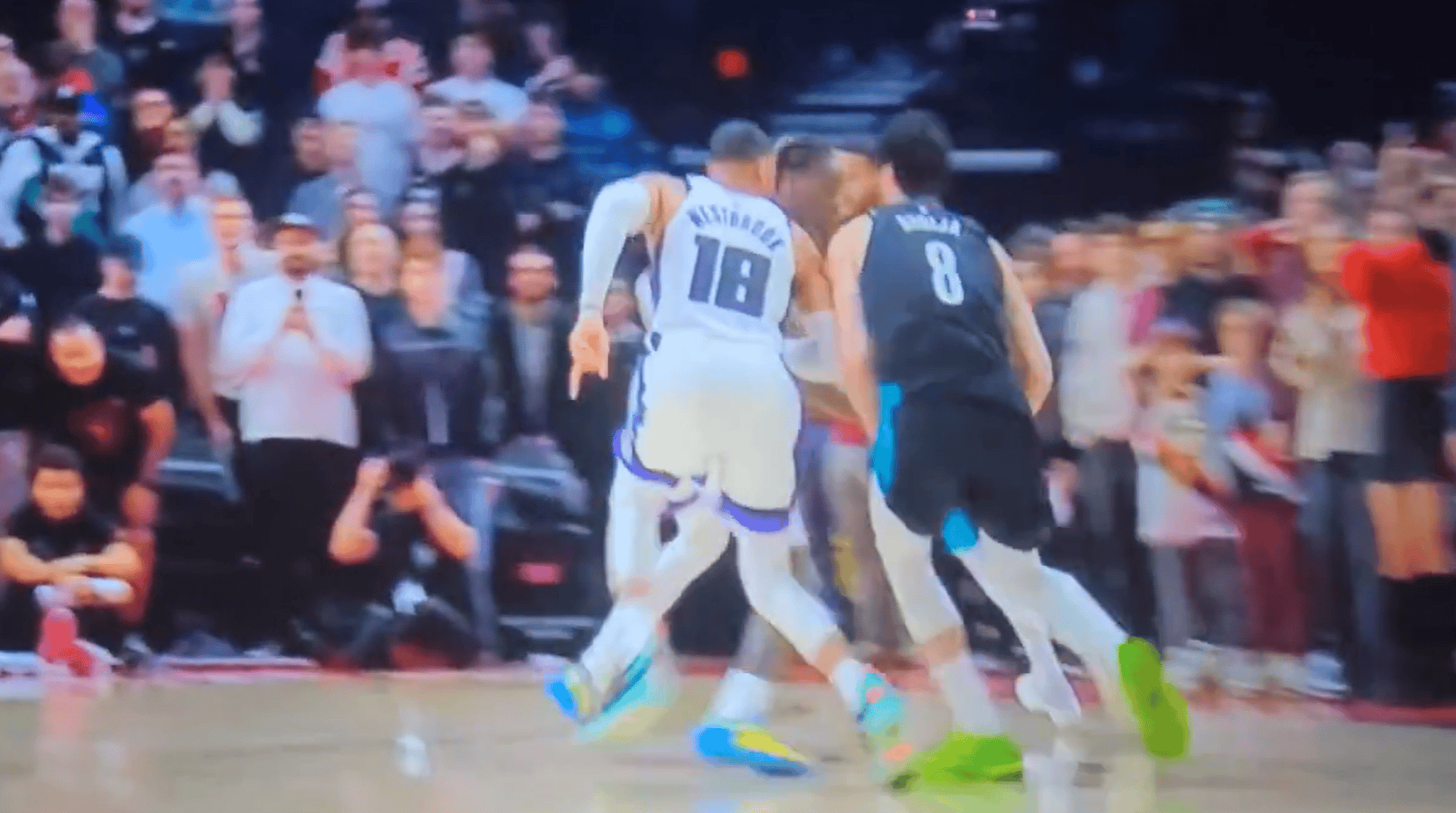 拉塞爾-威斯布魯克(國王)在防守中將右臂抬起并伸入丹尼-阿夫迪亞(開拓者)的手臂,主動(dòng)制造了身體接觸,并影響了他的投籃出手。在與回放中心溝通后,裁判確認(rèn):犯規(guī)發(fā)生在比賽時(shí)間結(jié)束之前。